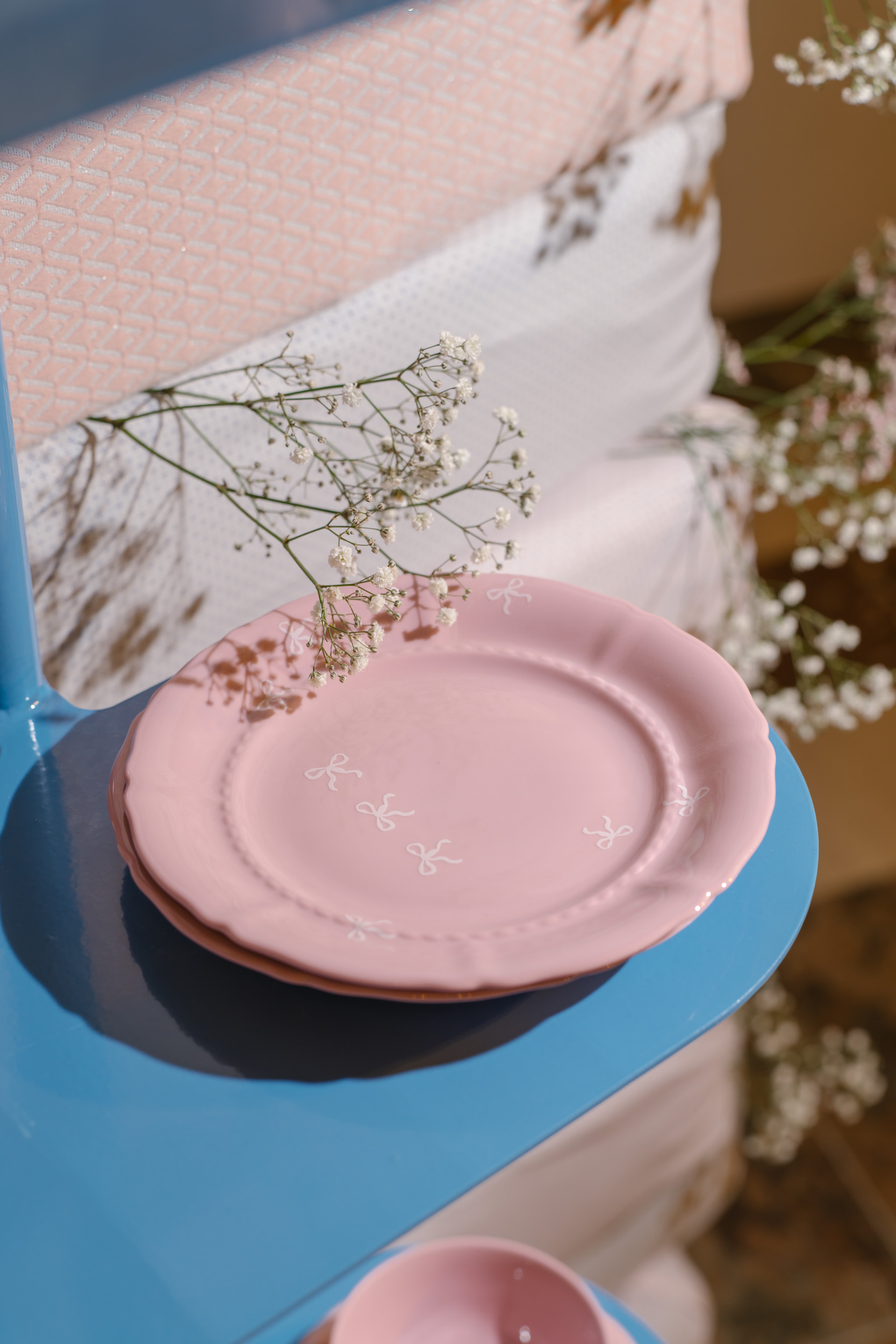 Desertní talířek z nové řady Dolores,  která vznikla ve spolupráci značky Křehký s designérkou Lindou Pro a Značkou Leander 1907, poslední českou porcelánkou, která růžový porcelán (růžový i ve střepu) vyrábí. Představeno na Designbloku 2025.